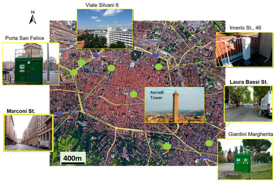 In particular, two intensive experimental field campaigns were carried out respectively during summer (10 August 2017–24 September 2017) and winter (16 January 2018–14 February 2018) to measure atmospheric flows and turbulence, air temperature and air quality within two different street canyons embedded in the city of Bologna. The city is located at the southern end of the Po Valley at the foothill of the Apennines chain, a region considered a hotspot for climate change and air pollution [50]. The city morphology can be considered as typical for European cities [51,52], characterized by a densely built historical center surrounded by residential suburbs and a small industrial area.