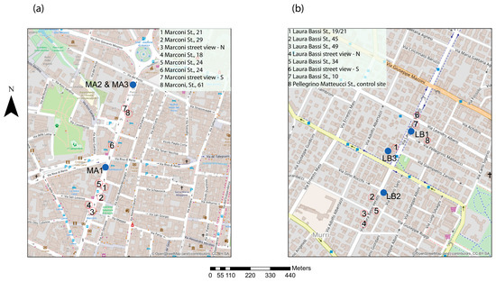 Positions of the monitoring sites (blue dots) and of the locations chosen for the temperature measurements of the building façades and of the ground surface during the two intensive thermographic campaigns in the two street canyons in Bologna (numbers within the red circles): (a) Marconi St. and (b) Laura Bassi St. (source: OpenStreet Map).