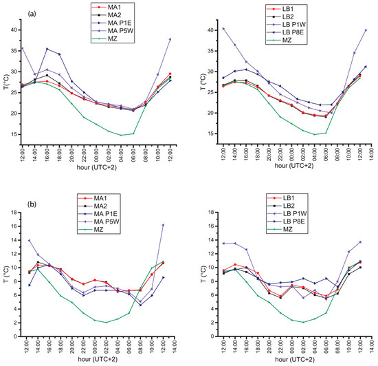 Temperature evolution within the day of the summer (22–23 August 2017) (a) and winter (8–9 February 2018) (b) intensive thermographic campaign in the two street canyons in Bologna (Marconi St. on the left and Laura Bassi St. on the right), measured by the thermo-hygrometers located at ground and mid-level (respectively site 1 and 2), the Agenzia Regionale per la Prevenzione, l’Ambiente e l’Energia dell’Emilia-Romagna (ARPAE) instrumentation in one rural meteorological station (MZ) and of building façades of buildings located on the west and east side of the two street canyons as retrieved from the thermal images acquired with the two thermal cameras.