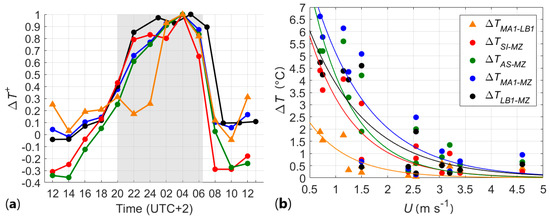 (a) Urban Heat Island (UHI) intensity from building façade temperature difference (solid lines) and in-canyon wind speed (dashed lines) evolution within the day of the summer intensive thermographic campaign in Bologna (22–23 August 2017). The shadowed region defines the nocturnal period between sunset (2000 UTC) and sunrise (0630 UTC). (b) UHI intensity from building façade temperature difference as a function of the in-canyon wind speed measured at the ground levels of each canyon.