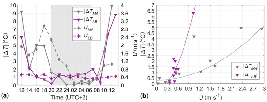 As by the mere definition of temperature difference between two locations, a very local UHI effect can be observed also within an urban canopy, where a horizontal temperature gradient can establish between the opposite sides of the canyon (building façade to building façade). More precisely, this temperature gradient acts as the primary forcing of the in-canyon thermal circulation. As for the large scale UHI phenomenon previously discussed, this local phenomenon establishes a relationship between the in-canyon wind speed and the building façade temperature difference (evaluated using the east and west canyon-side building façades shown in Figure 5). Figure 7a shows the similar behavior of these two quantities, highlighting that a direct proportionality relates the temperature difference and the wind speed (while it was inverse at larger scales). While at larger scales the wind speed was a cooling factor, within the canopy the temperature difference forces the circulation. The following quadratic fit suits this in-canyon dependency between the building façade temperature difference from the thermographic data and the in-canyon wind speed measured at the ground level of each canyon