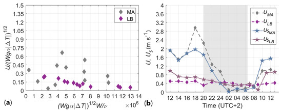 where is the gravitational acceleration, is the thermal expansion coefficient, is a length scale set equal to the canyon width, and is a constant computed by [58] from laboratory experiments and the similarity theory. Specifically, is given by the independency of of the Reynolds number (where in-canyon ground-level wind speed, is the mean canyon width, and is the kinematic viscosity of the air) evaluated comparing Equation (4) with , as done in Figure 8a. In our case, scaling the measured wind speed and evaluating its independency on the Reynolds number, we obtain different values of , named , equal to 0.13 and 0.32 for Laura Bassi St. and Marconi St., respectively. This discrepancy in the constant between the laboratory and the current investigation is associated with the inertial component of the wind speed, not accounted by Equation (4). To verify this hypothesis, we compute the total parametrized velocity as