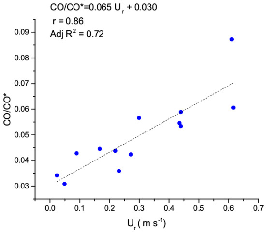 Figure 9 shows very clearly the existence of a relationship between the UHI velocity and the pattern of normalized concentrations in Marconi St., whereas in Laura Bassi the thermal circulation is not directly related with the pollutant distribution, which is driven by other mechanisms owing to the presence of trees and to the different morphology of the neighborhood. It should be noted that although the good relationship between Ur and the normalized concentration may appear counter intuitive, it is a consequence of the fact that the presence of a temperature gradient between two opposite façades may lead to the establishment of an opposite vortex [67], which confines the primary vortex closest to the ground and diminish the vertical exchange. The establishment of this new vortex depends on the strength of the temperature gradient. If not so strong and of the order of 10 °C as in our case, we will see that the effect of the temperature gradient will be to deform the vortex and finally diminish its ability to remove pollutants from the near surface. Simulations performed in the following section will be used to prove this argument. The rise in normalized concentration observed at Laura Bassi St. at 3:00 (local time) is due to the normalization procedure that uses a reference concentration CO* (Equation (6)). Further, while traffic pollutant concentrations (CO, but also NOx) show generally lower nighttime values and a first peak during the morning rush hours, the normalization procedure involves calculating the ratio with the reference CO* estimated with the pollutant source rate and the bulk velocity (the other values in the equation are linked to geometric factors and as such are constant values). Average conditions at 3:00 were characterized by high bulk velocities and low pollutant source rates (as connected with the reduced transit of vehicles during nighttime), altogether resulting in a very low CO* value and therefore a sharp increase of the normalized CO/CO* concentration. The scatterplot (Figure 10) of normalized CO concentrations vs. UHI velocity in Marconi St. confirms the presence of a linear relationship between the two quantities, suggesting that the thermal circulation inside the street canyon may increase the pollutant concentrations at pedestrian level, a result in agreement with previous modeling studies by [68,69] and with the nighttime negative correlations between UPI and UHI obtained by [16]. Previous literature [70] showed the reverse effect, i.e., that haze pollution may contribute further to the UHI, confirming again the presence of an interaction between air pollution and the UHI phenomenon. The reduced magnitude of normalized concentrations in Marconi St. during the summer thermographic campaign is due to the fact that our normalization procedure successfully removes all other factors driving pollutant concentrations in the street canyon, i.e., the geometry of the canyon, the pollutant emissions and the bulk wind speed above the canyon. Therefore, our results show the existence of a relation between the thermal forcing exerted by UHI and pollutant concentrations in a street canyon. In the following section, the scaling for heat and concentration and the existence of a linear relationship between concentrations and the thermal circulation is verified with CFD simulations adequately set up.