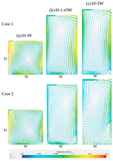 Velocity vectors obtained in the two cases within a street canyon with aspect ratio 1 (a), 1.65 (b) and 2 (c). Case 1 (top) and Case 2 (bottom).