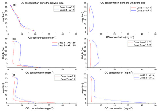 CO concentration profiles within a street canyon with AR equal to 1 (a), 1.65 (b) and 2 (c). Case 1 (red line) and Case 2 (blue line). Vertical profiles are shown by probe lines, one located at 0.5 m from the leeward side (panels on the left) and one on the windward side (panels on the right).