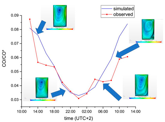 By considering the whole diurnal cycle for the cases AR equal to 1 and 2, respectively, a similar relation between Ur and CO/CO* as that derived in the previous section for AR equal to 1.65 and illustrated by Figure 9 and Figure 10 is obtained. Figure 13 shows the pattern of normalized CO concentrations obtained in the CFD simulations, as compared to the observed normalized concentrations. Also shown are the plots for the vortices for five times. As such, Equation (4) provides a simple model to describe how the temperature difference between building facades within the street canyon can drive the airflow dynamics and the shape of the vortices within the canyon and therefore the pollutant concentration.