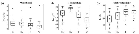 Seasonal variations of (a) wind speed (b) temperature (c) relative humidity (Sp—spring; Su—summer; F—fall; W—winter). The central box represents values from lower to upper quartile (25th to 75th percentile). The vertical line extends from the 10th percentile to the 90th percentile. The middle solid line represents the median. The gray diamond represents the arithmetic average. Maximal and minimal outliers are plotted as black dots.