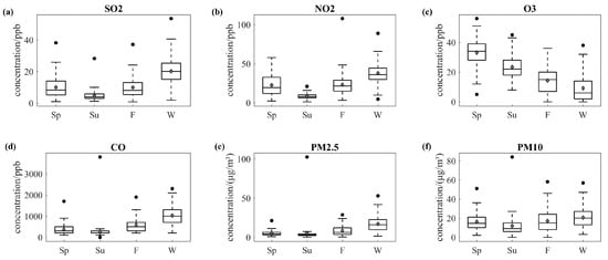 Seasonal variations of (a) SO2 (b) NO2 (c) O3 (d) CO (e) PM2.5 (f) PM10 (Sp—spring; Su—summer; F—fall; W—winter). The central box represents values from the lower to upper quartile (25th to 75th percentile). The vertical line extends from the 10th percentile to the 90th percentile. The middle solid line represents the median. The gray diamond represents the arithmetic average. Maximal and minimal outliers are plotted as black dots.