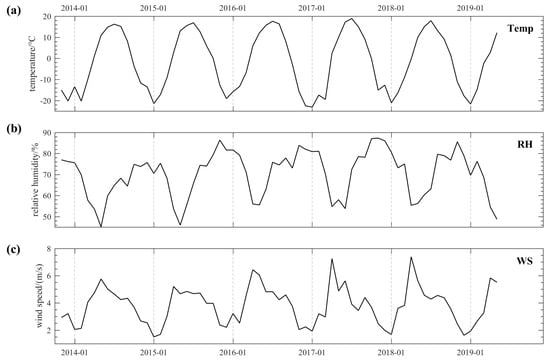 Monthly average variations of (a) temperature (b) relative humidity (c) wind speed from November 2013 to May 2019 (Temp—temperature; RH—relative humidity; WS—wind speed). Gray dashed lines represent January of each year.