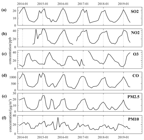 Monthly average concentration variations of (a) SO2 (b) NO2 (c) O3 (d) CO (e) PM2.5 (f) PM10 from November 2013 to May 2019. Gray dashed lines represent January of each year.