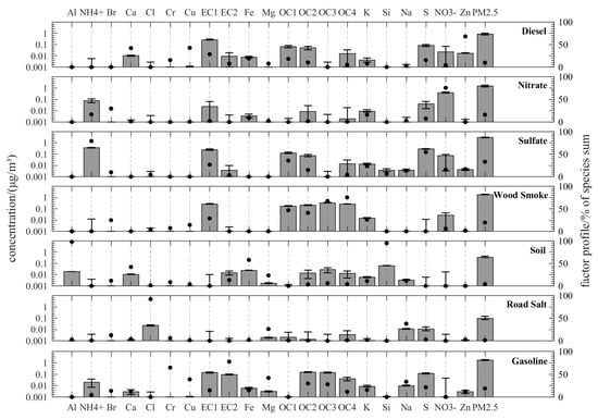 Source profiles. Bars represent species concentrations in each factor, y-axis on the left. Error bars represent displacement analysis (DISP) intervals, y-axis on the left. Dots represent species contributions, y-axis on the right.