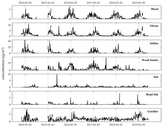 As the dominant air pollutant in Fairbanks, possible sources of PM2.5 were explored using receptor modeling. A seven-factor solution was picked based on relative values of Qrobust and Qtheoretical, scaled residual distribution, and profile interpretability, and the base run result (Fpeak = 0) turned out to be the most reasonable. Identified factors include diesel, nitrate, sulfate, wood smoke, soil, gasoline, and road salt (Table 6), whose profiles and temporal variations are shown in Figure 7 and Figure 8. After excluding data points with missing PM2.5 observations and those sampled on violation days (daily average PM2.5 concentration > 35 μg/m³) during the Aggie Creek Fire, PM2.5 predictions and observations were compared in Figure S2, while comparison with the complete data is shown in Figure S3. The regression (R² = 0.998, slope = 0.94) shows that the predictions reproduced the observations effectively when there were no sporadic emission events. Comparison with source apportionment results using 2005–2012 observations [3] was made to figure out possible changes in proportions and compositions of sources.