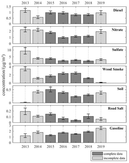 Annual concentration variations of PM2.5 sources. Dark gray bars represent years with data of every month. Light gray bars represent years with at least one month of missing data. Error bars represent one standard error.