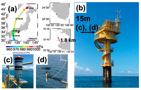 A series of observations were conducted using a disdrometer called SPC (Niigata Electric; []), anemometer, time-lapse camera, and tipping-bucket rain gauge installed on an observational tower maintained by the Disaster Prevention Research Institute of Kyoto University (33°42′32″ N, 135°19′58″ E) at a vertical height of 15 m above sea level (Figure 1a). This height is higher than the one set in [], so we do not consider the increase of sea spray generation by rainfall. The tower lies 1.8 km off the coast (see the two-headed arrow of Figure 1a). All wind speed and rainfall measurements were validated based on the data obtained from an automated meteorological data acquisition system (AMeDAS) weather station, which was located 4 km south of the tower and maintained by the Japan Meteorological Agency []. This station was equipped with a tipping-bucket rain gauge with resolution, 0.5 mm h−1. We conducted continuous observations during two rainfall events, from 14 to 16 August and 17 to 19 October in 2019. These periods included the extreme event of Typhoon Krosa, and the typhoon track and central pressure are shown in Figure 1a.