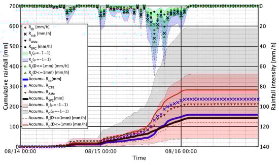 Time series of rainfall intensity and cumulative rainfall from August 14 to 16 in 2019 (JST). Rainfall intensity (right axis) of Rtb and Rctb shown in red circles and black crosses, respectively. Rainfall intensity detected at the automated meteorological data acquisition system (AMeDAS) station (RAMe) is indicated in black triangles, and the intensity calculated from the SPC data (RSPC) is in black circles. The areas where the estimated results ((Rr(D < 1) and Rc(D < 1)) are described in Section 2.4, are highlighted in blue and green; they depend on the shape parameter (μ) values ranging from −1 to 1. The green circles and triangles represent Rr(D < 1) and Rc(D < 1) with μ = 0. Left vertical axis shows the cumulative rainfall for each component (Rtb, Rctb, RSPC, Rr(D < 1) and Rc(D < 1)) from 00:00 14 August (JST). Cumulative rainfall of Rtb and Rctb are shown in blue solid line and blue crosses, respectively, and that of RSPC is in black line. Cumulative rainfall of Rr(D < 1) and Rc(D < 1) with μ = 0 are expressed in red solid and dashed lines, respectively. Red area indicates the difference between the shape parameter μ = −1 and 1 where AMeDAS data points are plotted as red triangles.