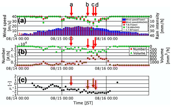 Time series of hourly wind speed and rainfall intensity (Rtb, Rctb, and RAMe), as well as the total number and volume of droplets and drop size distribution (DSD) shape parameter μ. (a) Wind speeds at the tower and AMeDAS station are expressed in blue and red bars, respectively. Rtb and Rctb are shown in green dots and black crosses, respectively, and RAMe is in red dots. (b) Red circles indicate the total number of droplets detected by the SPC. Green squares indicate total volume of particles. (c) DSD shape parameter μ is shown. Arrows in (a–d) indicate the time points photographed in Figure 4.