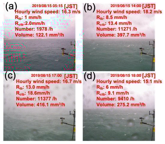 Figure 4 shows the time-lapse photographs of the sea surface conditions at the time points indicated by the arrows in Figure 3a–d. In Figure 4a, Rtb and Rctb were 1 and 2 mm h−1, with 1978 droplets per hour and a volume of 122.1 mm3 h−1, suggesting that the sea was calm. In Figure 4b, whitecaps were visible at a wind speed of 18.2 m s−1 and the rainfall intensities (Rtb and Rctb) were 8.5 mm h−1 and 13.4 mm h−1. In Figure 4c, the sea surface was covered with sea spray and streamlines were visible, assuming that droplets recorded by the disdrometer must have included sea spray. After the rainfall ended, some whitecaps remained (Figure 4d). From the time-lapse photographs, the disdrometer was not covered with waves, and the maximum significant height was 4.23 during the observation periods. The data sets were thus not influenced by waves directly.