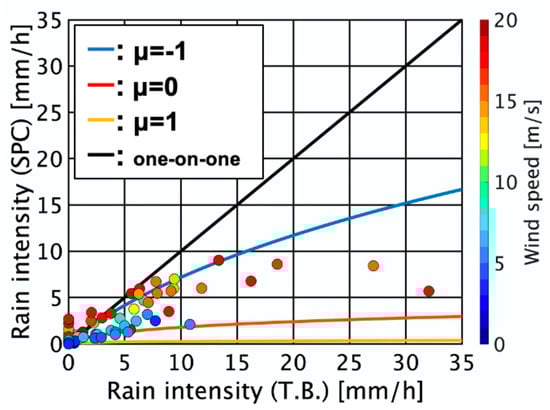 Relationship between rainfall intensity (Rctb) and the intensity derived from SPC data (RSPC). Hourly wind speed is indicated in bar colors. Lines indicate the relationship between rainfall intensity of drops with diameters less than 1 mm and total rainfall intensity based on Ulbrich distributions for different values of μ, where light blue = −1, red = 0, and orange = 1. Black line indicates a one-on-one line.