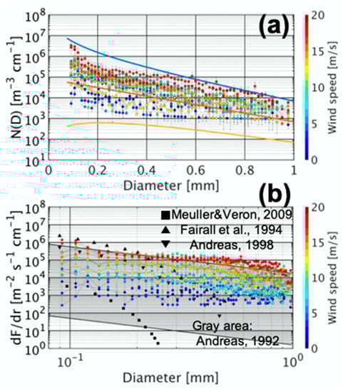 To investigate the proportion, DSDs of sea spray need to be discussed. Figure 6 shows the DSDs of rain and sea spray derived by the disdrometer during two periods—August and October, 2019—without rainfall monitored by the rain gauge. Even when the rain gauge revealed no rainfall, it was possible that rainfall may have been less than 0.5 mm h−1, due to the resolution of the rain gauge. Usually, the DSD of rain is given in units of m−3 cm−1, and that of sea spray in units of m−2 s−1 cm−1. The DSDs of rainfall below the resolution of the rain gauge and sea spray were averaged at the various wind speeds (from 1 to 20 m s−1) at 1-m s−1 intervals, in which the standard deviations derived (Figure 6a). The three DSD lines were derived from Equation (1) at rainfall of 0.5 mm h−1 and μ values of −1, 0, and 1. All DSDs were within the range of the lines; however, to date it is difficult to define the causality of why the number of droplets increased with horizontal wind speed. In contrast, if the droplets were considered to be sea spray, the DSDs would be similar to the DSDs of sea spray reported previously for sea spray [,,,] (Figure 6b). Our findings were higher than the findings obtained at low wind speeds (up to 15 m s−1), and presumably the DSDs from Figure 6a,b were DSDs of either rain or sea spray. Notably, the direct measurement of sea spray DSDs offers valuable data sets (Figure 6), as the direct approach has been rare in this field of study.