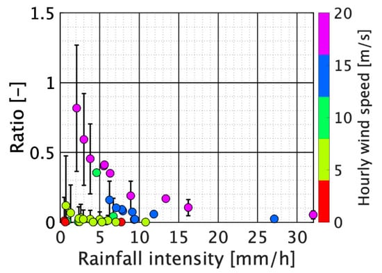 Relationship between rainfall intensity of Rctb and ratio of sea spray against Rctb. Bar colors indicate hourly wind speed. Black bars indicate the maximum and minimum ranges.