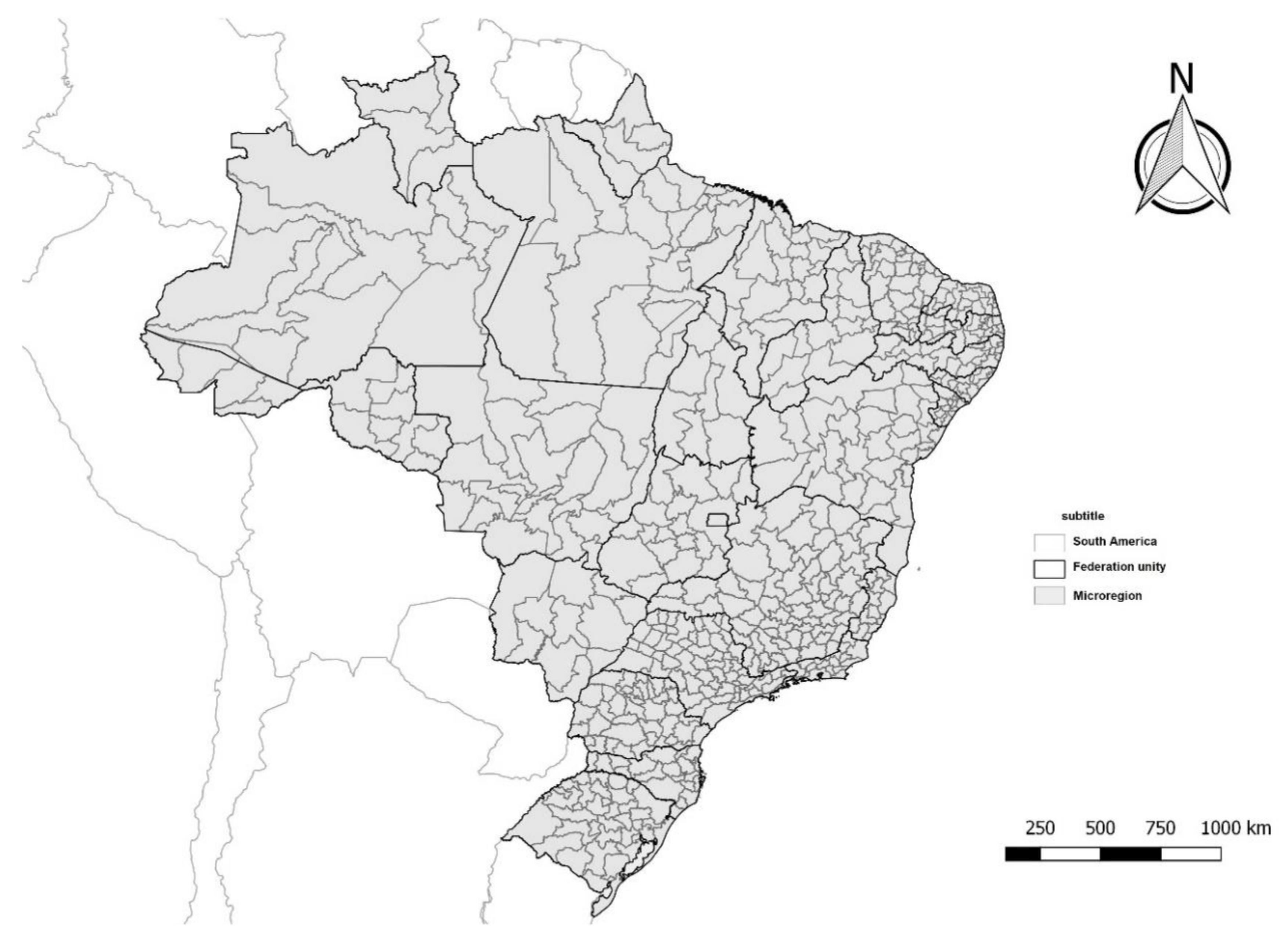 - IBGE. Divisão Regional do Brasil em Regiões Geográficas Imediatas e Regiões Geográficas Intermediárias: 2017; Coordenação de Geografia, IBGE: Rio de Janeiro, Brazil, 2017. [Google Scholar]
