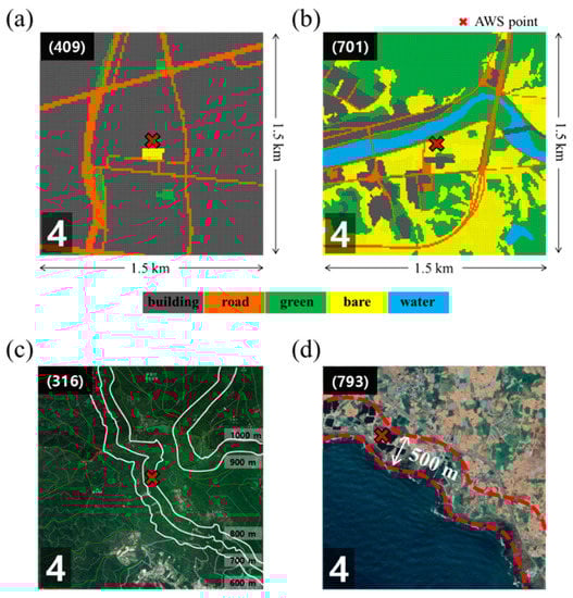 Classification of the automated weather stations (AWSs) for land-use (a,b) and topography types (c,d). Red symbols and white solid lines in (c) represent AWSs and contour lines, respectively. The deviant crease lines in (d) indicate the area within 500 m from the coastline.