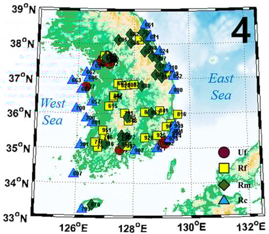 First, we followed previously described classification methods [25,26,27] to characterize the region (1.5 × 1.5 km2, to match the horizontal LDAPS grid) surrounding each of 100 AWSs using land cover and topography data obtained from 1:25,000 land cover maps provided by the environmental geographic information service (EGIS) of the Ministry of Environment, Korea (Figure 1). For example, if the region surrounding an AWS had a ratio of urban (U) to rural (R) land cover of >50%, then that AWS was classified as U; otherwise, it was classified as rural R [25]. Topography was classified based on digital maps created by the National Geographic Information Institute of Korea in 2015. An AWS with altitude of >200 m in the surrounding area was classified as mountainous (m) [26]. An AWS located within horizontal distance of 500 m of a coastline was classified as coastal (c) [27]. Any AWS not classified as m or c was considered on flat terrain (f). The combination of both classification schemes yielded six categories: Um, Uc, Uf, Rm, Rc, and Rf. However, preliminary classification showed that AWSs in the Um and Uc categories were very rare in Korea. Therefore, in this study, we selected 25 AWSs (Figure 2) for each of the four remaining categories (Uf, Rm, Rc, and Rf) to identify the characteristics of LDAPS-predicted wind speeds and temperatures. Dynamical and biophysical effects of land covers are not considered in the analysis.