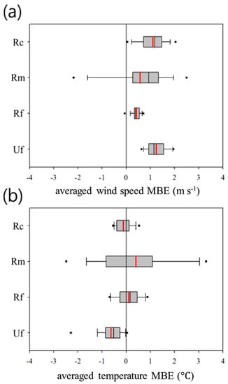We calculated the mean bias error (MBE) of LDAPS prediction results for the 25 AWSs in each category during the study period and compared their averages. For details of the AWSs considered in this study, see Table A1 in Appendix A. Figure 3 shows boxplots of the MBE of wind speed (WE) and temperature (TE) for the four categories. In all categories, LDAPS generally overestimated the measured wind speed. Average WE was highest in Uf (1.26 m s−1) and lowest in Rf (0.42 m s−1). Rm showed the widest variation in WE (−2.38 to 2.68 m s−1), but a lower average (0.57 m s−1) than Rc, which had an average WE of 1.06 m s−1 (standard deviation (SD) = 0.52 m s−1). LDAPS overestimated surface wind speeds at all AWSs (Figure 3a).