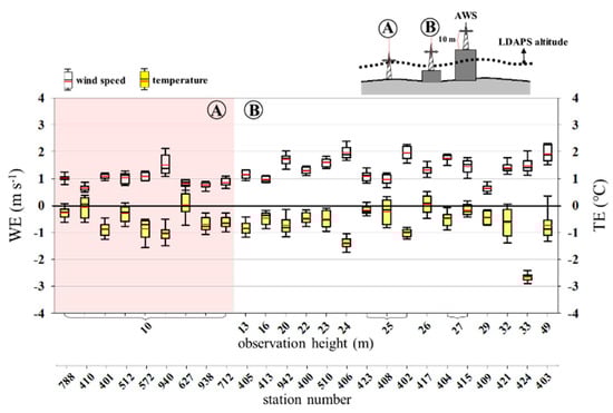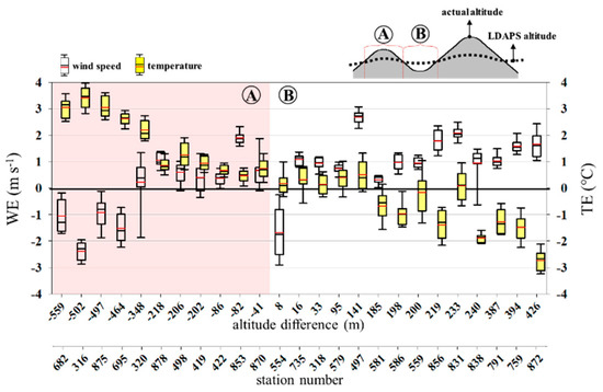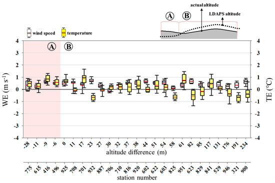 Box plots of the WEs and TEs at the Rf AWSs. The x-axis represents difference between the LDAPS and actual altitudes at the AWSs. Left panel shaded in pink represents the cases that the LDAPS altitudes are lower than the actual altitudes (Ⓐ). Right panel shaded in blue indicates the opposite cases (Ⓑ).