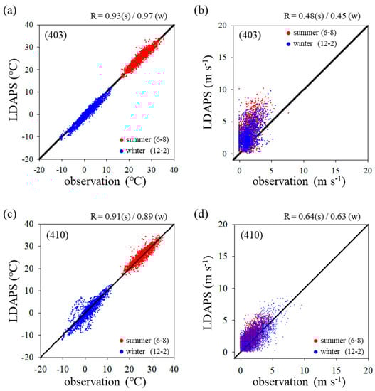 Scatter plots of the AWS-observed and LDAPS-predicted temperatures (left panels) and wind speeds (right panels) at the (a,b) AWS 403 (installed on a building roof and (c,d) AWS 410 (installed on the ground level). Red and blue dots indicate for summer season (June, July, and August) and winter season (December, January, and February), respectively.