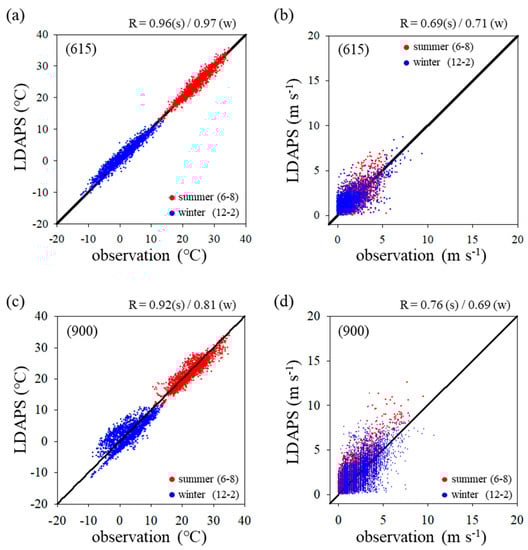 Scatter plots of the AWS-observed and LDAPS-predicted temperatures (left panels) and wind speeds (right panels) at the (a,b) AWS 615 (located at a flat rural area) and (c,d) AWS 900 (located at a basin area). Red and blue dots indicate for summer season (June, July, and August) and winter season (December, January, and February), respectively.