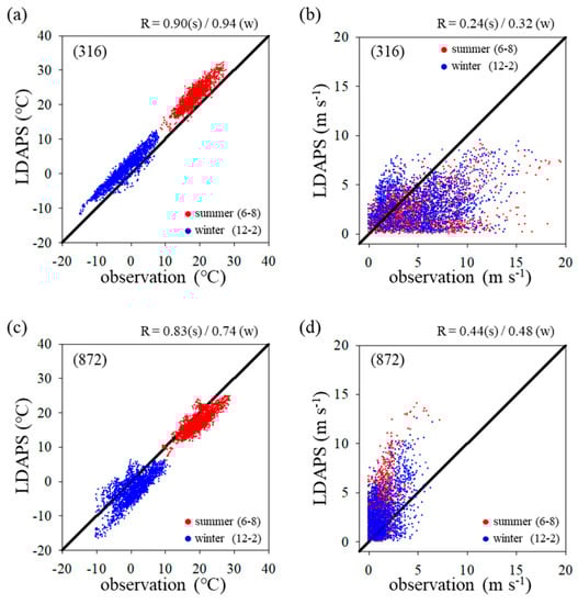 Scatter plots of the AWS-observed and LDAPS-predicted temperatures (left panels) and wind speeds (right panels) at the (a,b) AWS 316 (LDAPS altitude < AWS altitude) and (c,d) AWS 872 (LDAPS altitude > AWS altitude). Red and blue dots indicate for summer season (June, July, and August) and winter season (December, January, and February), respectively.