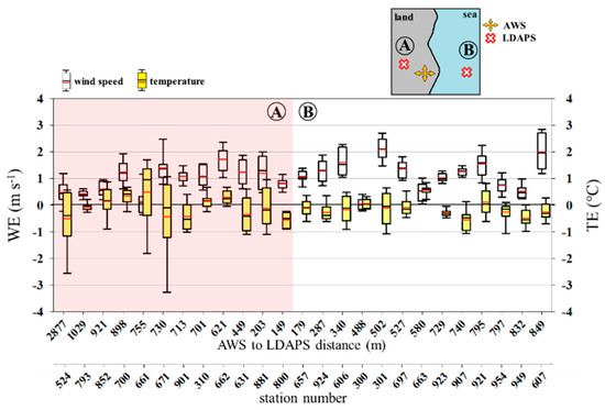 Box plots of the WEs and TEs at the Rc AWSs. Left panel shaded in blue and right panel shaded in red represent the cases that the LDAPS grid point closest to a comparison AWS is located at the land (Ⓐ) and sea (Ⓑ), respectively.