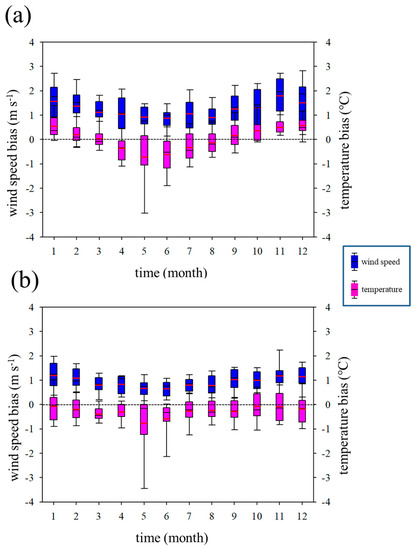 Monthly MBEs of wind speeds and temperatures predicted by LDAPS at the Rc AWSs. The LDAPS grid point closest to a comparison AWS is located at sea in (a) and land in (b).