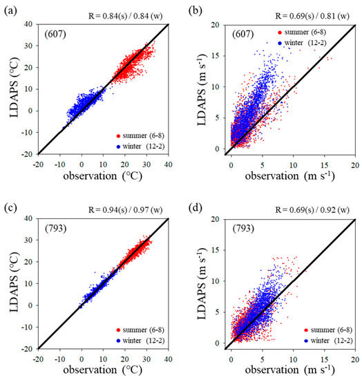 Scatter plots of the AWS-observed and LDAPS-predicted temperatures (left panels) and wind speeds (right panels) at the (a,b) AWS 607 (LDAPS grid located at sea) and (c,d) AWS 793 (LDAPS grid located at land). Red and blue dots indicate for summer season (June, July, and August) and winter season (December, January, and February), respectively.