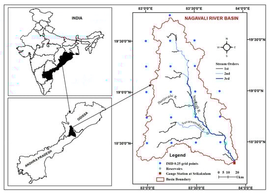 We selected the Nagavali River Basin (NRB) since the literature on semi-arid and semi-humid climatic regions is limited. NRB lies between the Godavari and Mahanadi river basins in the eastern part of India, with a catchment area of about 9510 km2 (Figure 1). The river begins from the Eastern Ghats at an elevation of 1600 m. It traverses about 160 km through Odisha and enters Andhra Pradesh near Kuneru village of Vizianagaram district at an elevation of about 152 m []. The extent of the basin is 18°17′ to 19°44′ north latitudes and 82°53′ to 83°54′ east longitudes. The stream length ranges around 255 km, out of which the main 62% lies in Odisha and the rest in Andhra Pradesh.