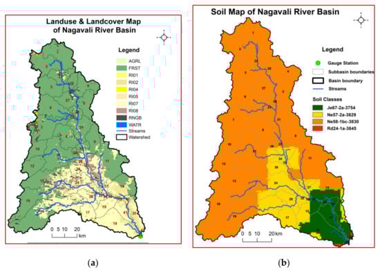 Land use land cover classification (a) and soil map (b) with subbasins for Nagavali River Basin (NRB). QSWAT interfaced with a quantum geographical information system (QGIS) was used for developing the hydrological model.