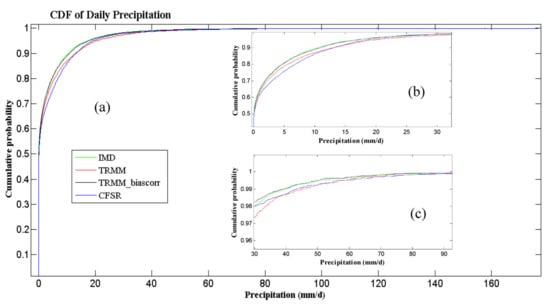 We observed that the maximum precipitation values were slightly overestimated by TRMM and CFSR datasets in comparison with the IMD product. Similarly, the CFSR is more positively skewed than the IMD, showing the general tendency for overestimation. The empirical cumulative density function (CDF) of the daily precipitation distribution during 1998–2012 was computed for the four datasets (Figure 3). There is a slight difference in the CDF obtained for IMD, TRMM and CFSR data at low values of rainfall. However, the deviation is significant in the precipitation range from 30 to 60 mm/day for TRMM and CFSR data. The CDF of the bias-corrected TRMM is closely matching with that of IMD.