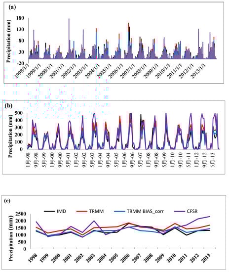 To evaluate the overall pattern and rainfall quantity, rainfall datasets on three different time scales—daily, monthly and annual—were considered. On a daily scale, the linear Pearson correlation between the IMD and other data sets such as TRMM, bias-corrected TRMM and CFSR datasets was found to be 0.44, 0.83 and 0.82, respectively. The daily and average monthly time series of the rainfall events of four datasets are shown in Figure 4a,b. It is evident that there is a significant difference between precipitation products. The monthly variation of the precipitation values shows there is no systematic over or under prediction by CFSR or TRMM data. For example, during the 2003 monsoon, CFSR and TRMM overestimated the rainfall, whereas during the years 2004 and 2005, the rainfall was underestimated. On the annual time scale (Figure 4c), different products show that there is a strong similarity in terms of rainfall totals for the most part of the study period. However, in the latter part of the study period (2009–2013), TRMM and CFSR data overestimate the rainfall compared to the IMD-based values. The standard deviation of the four precipitation datasets computed at the annual time scale over the 16 years considered is 270 mm, 222 mm, 193 mm and 415 mm for the IMD, TRMM, bias-corrected TRMM and CFSR, respectively and the results of two-sample Kolmogorov–Smirnov (Setti et al. [] tests at the 5% significance level indicate that the four precipitation datasets have different statistical distributions in the study area.