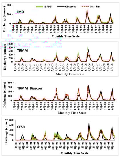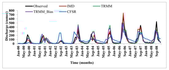 In the second step, the other precipitation products are used for driving the calibrated model. Figure 5 shows the streamflow simulation results from each of the precipitation products, and the corresponding performance statistics are shown in Table 7. It is observed that even though the TRMM dataset-based model is performing satisfactorily in driving the model, according to Moriasi et al. []. However, streamflow estimates show systematic overestimation with PBIAS = −15.3%. Interestingly, the systematic difference has significantly reduced in the bias-corrected TRMM-based model with PBIAS = −7.4%. The streamflow simulation using the CFSR data seems to be overestimated with PBIAS = −16.2%. However, it is to be noted that in the case of the CFSR, the streamflow overestimations are not systematic; rather, the pattern streamflow closely follows the precipitation pattern. There is considerable streamflow overestimation in the year 2003, during which the rainfall estimates were higher than the IMD data. On the other hand, the streamflow simulation was underestimated during the years 2000, 2004 and 2005, where the rainfall estimates from CFSR were lower than IMD. Thus, there is no systematic under or overestimation in the streamflow simulation.
