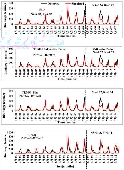 The individual models were developed based on four different data sets and were calibrated at a monthly scale using the SUFI-2 algorithm. The results from the model calibration are enumerated for all the models in Table 10. Following the model performance classification of Moriasi et al. [], the model based on IMD precipitation data performs well with NS (R2) values on the range 0.85(0.87) and 0.79(0.82) during the calibration and validation period, respectively. On the other hand, the CFSR data-based model performance is satisfactory with the NS values 0.76 and 0.73 during calibration and validation, respectively. The models based on TRMM and bias-corrected TRMM dataset produced better results with NS equal to 0.71 and 0.74, respectively, as shown in Table 10. A similar pattern was observed in the PBIAS values during the calibration and validation period.