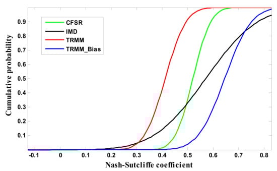 Besides the evaluation of the results from the best simulation from each precipitation data set, as explained above, we also investigated the ensemble of all available simulations. We calculated the distribution of the NSC values obtained for the total of 2000 simulations. Figure 7 shows the empirical CDF of the NSC values obtained from the four models. All four models reached a satisfactory level of performance. However, interesting results were obtained using the bias-corrected TRMM data set, where most of the simulations (around 80% of the model simulations) were above NSC = 0.5, while IMD, TRMM, CFSR data sets had a lower fraction on the order of 70%, 20% and 65%, respectively. IMD data-based model displays a larger fraction (50%) of model simulations having NSC > 0.65, which represents excellent model performance. On comparing the bias-corrected TRMM dataset and TRMM-based models, there is a significant improvement in the bias-corrected TRMM-based results. This analysis indicates the uncertainty in terms of model performance when using different precipitation data sets.