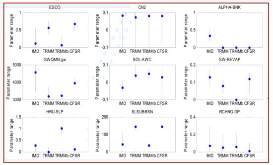 The parameter uncertainty when using different precipitation data sets was estimated by investigating the variations in the best-fit parameters, and the range of parameters obtained during the calibration. Table 11 and Figure 8 show the values and range of the best-fit parameters of the calibrated parameters of nine global sensitive hydrological parameters, respectively. Among the critical parameters shown in Figure 8, ESCO, an important parameter related to soil evaporation, have different ranges for the different datasets. It is also to be noted that the range of the parameters for ESCO obtained using IMD is different from the ones obtained from other precipitation data sets. TRMM and CFSR dataset-based models have a high ESCO value >0.5 when compared to IMD, and TRMM bias-corrected-based models indicate lower evapotranspiration compared to other datasets, which are also reflected in overestimation of streamflow.