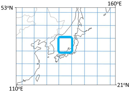The target grid (thick blue box) at 135.0° east (E) and 36.0° north (N) in the grid system (thin blue lines) within the Loch-Vecode-Ecbilt-Clio-agism (LOVECLIM) model.