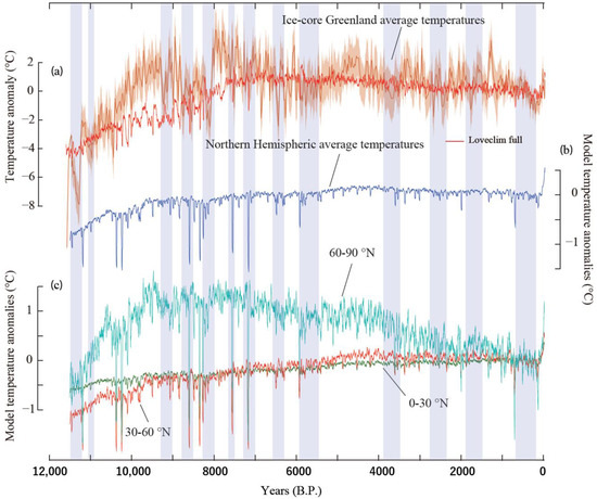 (a) Time series of temperature anomalies reconstructed from a proxy of ice cores and of those simulated with LOVECLIM in Greenland during the Holocene. Thick and thin orange lines denote reconstructed and LOVECLIM results, respectively. (b) Time series of mean temperature anomalies in the Northern Hemisphere simulated with LOVECLIM. (c) Same as in (b) but represented separately for high (60–90° N) and mid (30–60° N), and low latitudes (0–30° N). An anomaly was defined as a deviation from the latest 1000 year mean temperatures. The light-blue shading denotes predominant climatic events. This figure was drawn on the basis of Figure 3 in [14] (CC BY).