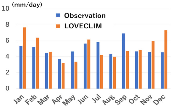 Precipitation at Maizuru (135.32° E, 35.45° N) was used for a comparison of present-day climatological mean monthly precipitation between the ground observation (available from http://hydro.iis.u-tokyo.ac.jp/CGLB [22]) and LOVECLIM. The intervals used were 1981–2010 for the ground observation and the last 30 years for the LOVECLIM simulation.