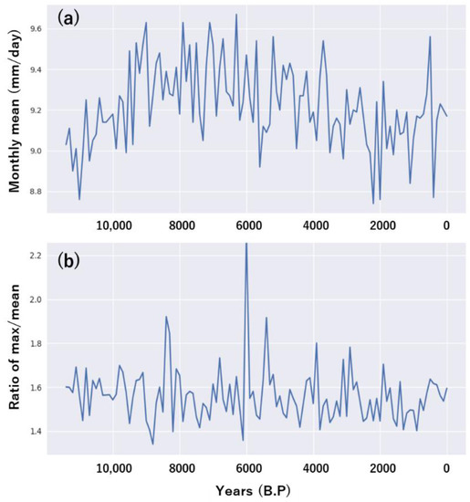 The 100-year maximum values of annual maximum monthly precipitation every 100 years are depicted as a time series after normalization in Figure 4b, with the climatological means for each 100-year period. These ratios had a mean value of about 1.5 with a relatively large range of 1.4–2.2 with respect to the 100-year climatological means in Figure 4a, with no obvious trend seen on the 10,000-year time scale. The maximum value of 2.3 occurred in the 100-year interval of 6000 BP (6100 BP to 6000 BP), followed by the second largest value of 1.93 in the 100-year interval of 8400 BP and the third largest value of 1.91 in the 100-year interval of 5500 BP. These peaks were not maintained for multiple 100-year intervals.