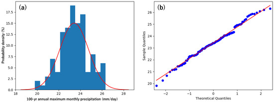 Assuming stationarity of the annual maximum monthly precipitation for a given 100-year interval and the 100 samples distributed with a Gumbel distribution, we calculated the estimated annual maximum monthly precipitation with a return level of 100 years for each 100-year interval. The histogram of estimated annual maximum monthly precipitation in Figure 5a displays a distribution almost symmetric to the mode, although both tails seem less frequent. The red line denotes a normal distribution estimated on the basis of the histogram sample statistics. Over- and underestimations can be seen in the tails, whereas the estimated normal distribution fit the histogram, especially within ±1 σ. The low level of frequency exceeding ±2 σ confirmed the suitability of the estimated normal distribution. Large gaps at ±1 σ (22 and 24.5 mm·day−1) can be seen in Figure 5b. The skewness and kurtosis values of the data distribution were 0.05 and −0.19, representing a near-normal distribution. Moreover, Bartlett’s test was performed to detect the deviation from normality, further confirming the normal distribution (p < 0.01).
