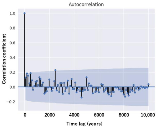 Persistency was analyzed through an autocorrelation of the time series of estimated annual maximum monthly precipitation with a return level of 100 years for each 100-year interval. Note that the adjacent values were independently estimated from a set of 100 samples of a 100-year interval, whereby lag 1 denotes one 100-year interval. The estimated annual maximum monthly precipitation with a return level of 100 years for each 100-year interval was uncorrelated, even with lag 1 (Figure 6). In other words, the estimated annual maximum monthly precipitation within a 100-year interval was not related to the previous and subsequent intervals. Statistically significant periodicity with a lag of 25 or 2500 years was seen; however, this could not be attributed to a climatic phenomenon since no periodic climatic cycle with this lag is currently known.