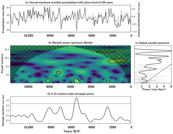 Figure 7b shows the wavelet power spectrum of the annual maximum monthly precipitation with a return level of 100 years. The significant power spectrum indicated by the black line appeared only in a very limited area of the time–frequency space in Figure 7b. Here, 200-year cycles were found around 8000 BP, 5500 BP, and 2400 BP, while a 600-year cycle was found around 7200 BP. A long cycle of approximately 1200 years was found around 2000 BP to present. Significant powers could only be seen within such short epochs; however, the climate change leading to these powers requires further investigation. The local maxima of the power spectrum were, thus, very limited in the time–frequency space, while the local minima were widely distributed (e.g., 10,000–8000 BP at 300–800-year periods).